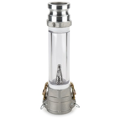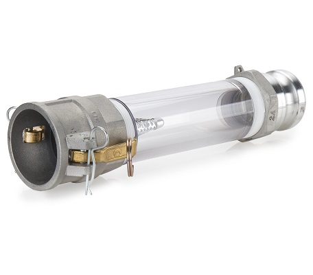 The VARCo sight strainer allows the operator to see flow and debris being transferred through a hose assembly! The sight strainer assembly includes an 8" polycarbonate sight glass tube, a funnel strainer, a type A camlock fitting, and a type D camlock fitting. The type A & D cam and groove fittings screw into each side of the polycarbonate tube and the funnel strainer fits inside the type D fitting.