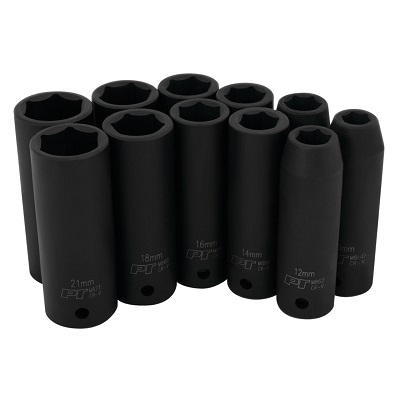 Performance Tool's 11-piece set of impact sockets made from durable chrome vanadium steel. Laser-etched size identification.