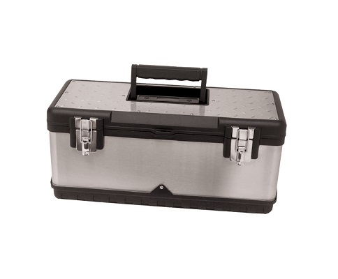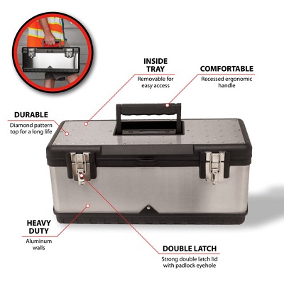 Performance Tool's heavy-duty 20-inch steel tool box with an inner tray, a recessed ergonomic handle, and double latch closure.