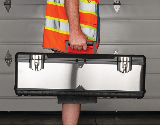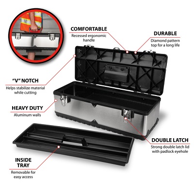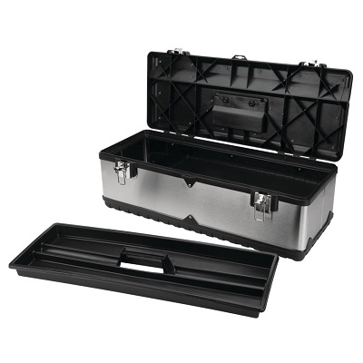 Performance Tool's heavy-duty 26-inch tool box with an inner tray and a recessed ergonomic handle. Double latch with padlock eyehole for added security.