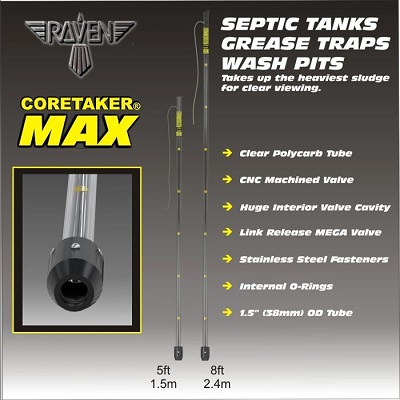 Coretaker MAX is used in septic tank and grease interceptor maintenance to view and check sludge/solids levels. For septic pumpers, inspectors, grease traps, waste oil collection, or any other job that deals with heavy settled solids.