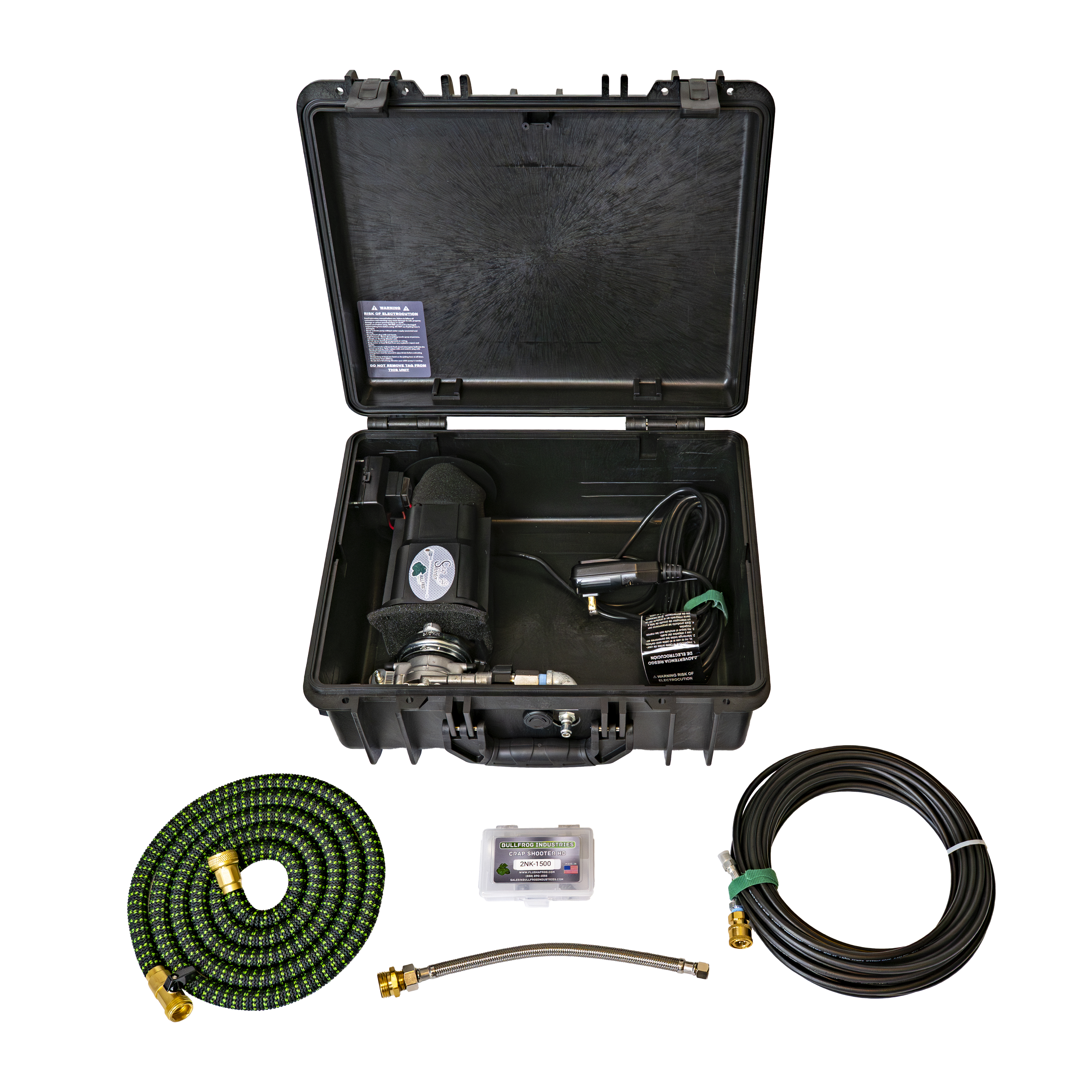 Everything you need for the first service call is included in the standard Crap Shooter HD case. On the pressure side, you’ll have a 50′ x 1/8″ jetting hose along with a standard two nozzle kit. On the supply side, you have a 25′ expandable water hose with ball valve compatible with any common water spigot. We include a stainless steel braided adapter line compatible with common 3/8″ fixture supply valves which also has a garden hose adapter to easily attach to the Crap Shooter HD.