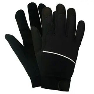 Black mechanics gloves with synthetic leather finger tips and padded palm.