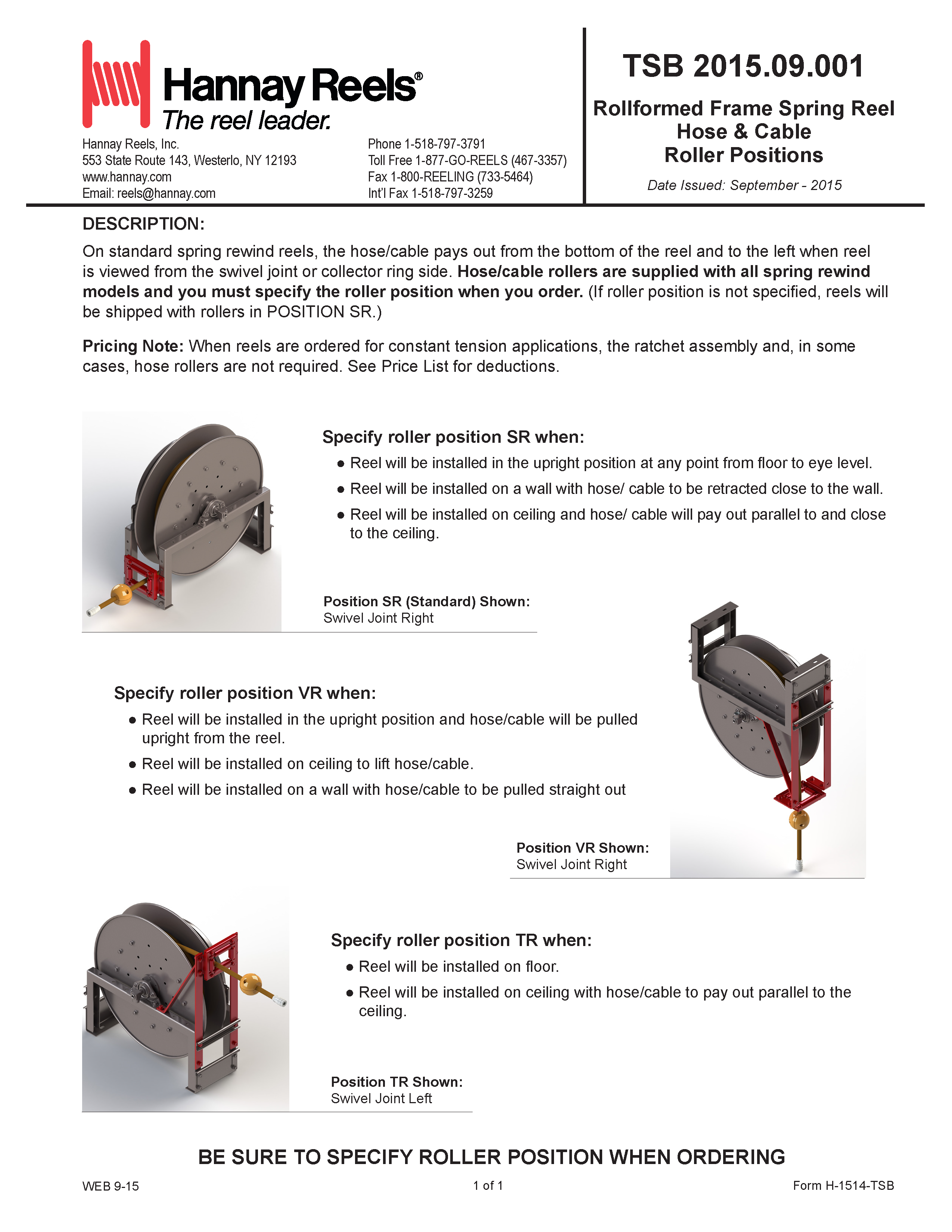 - Spring Rewind Roller Positions - Hannay Reels Information - Hannay Reels Ordering Guide |