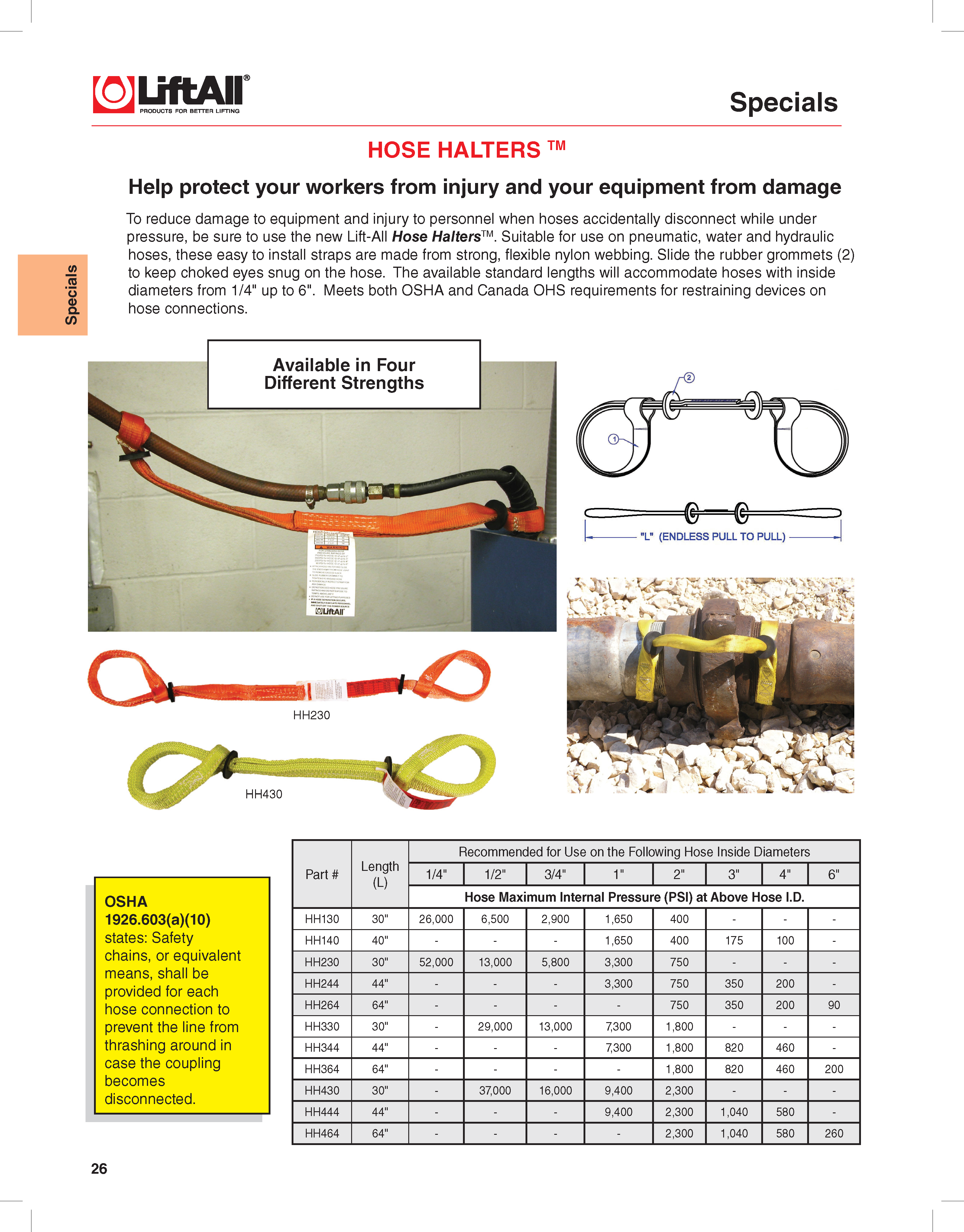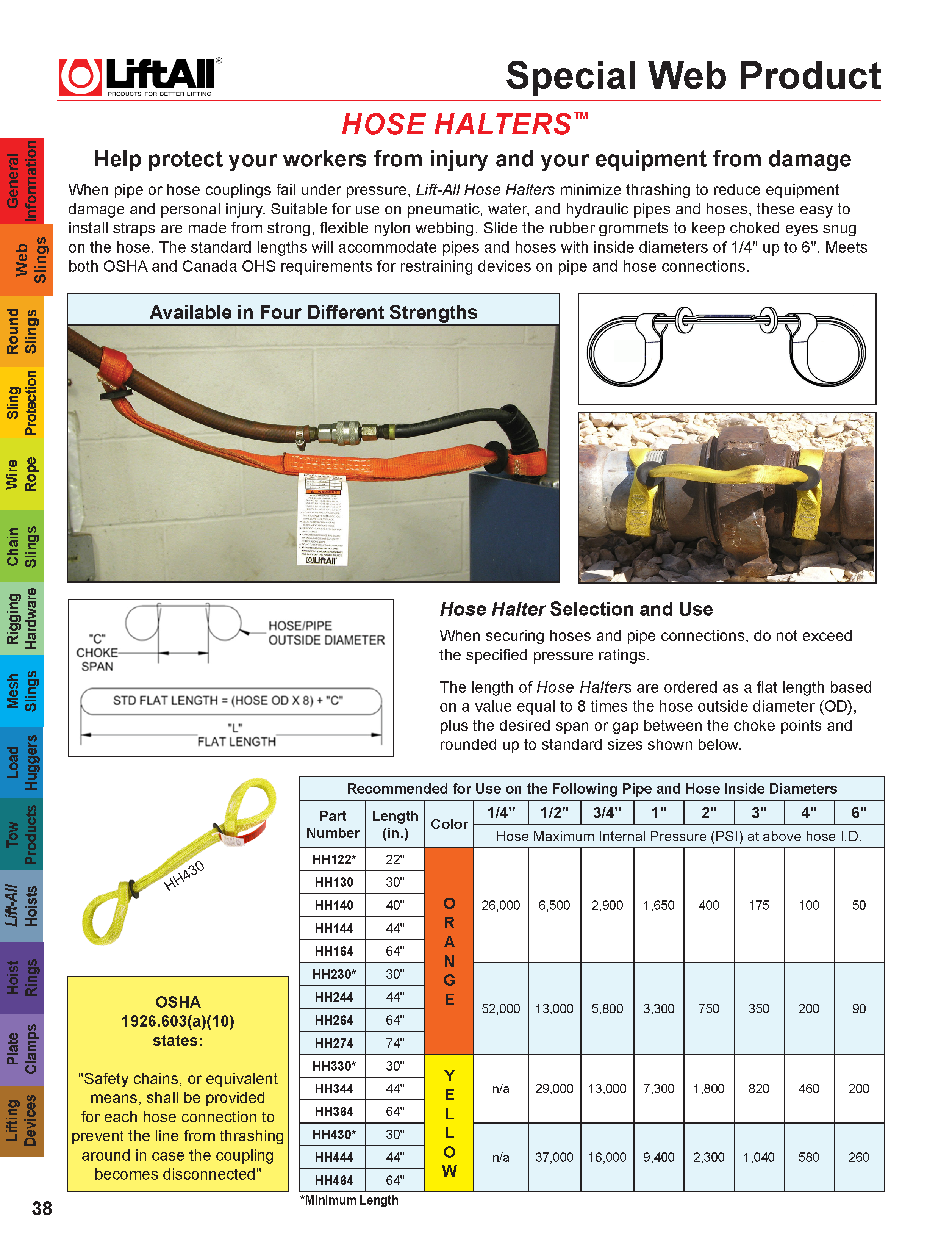 When pipe or hose couplings fail under pressure, the hose halters minimize thrashing to reduce equipment damage and personal injury. Suitable for use on pneumatic, water, and hydraulic pipes and hoses, these easy to install straps are made from strong, flexible nylon webbing. Slide the rubber grommets to keep choked eyes snug on the hose. The standard lengths will accommodate pipes and hoses with inside diameters of 1/4" up to 6". Meets both OSHA and Canada OHS requirements for restraining devices on pipe and hose connections.
