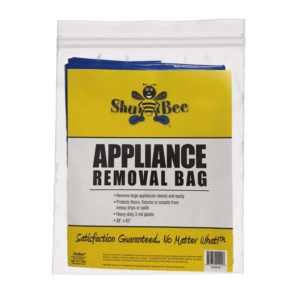 ShuBee’s® Appliance Removal Bag is made of a heavy-duty 3 mil plastic and is 38”x65”.
