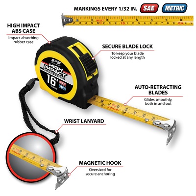 - • Quick-read SAE scale with fractional numbers every 1/8" along the top half and Metric measurements along the bottom half of the blade