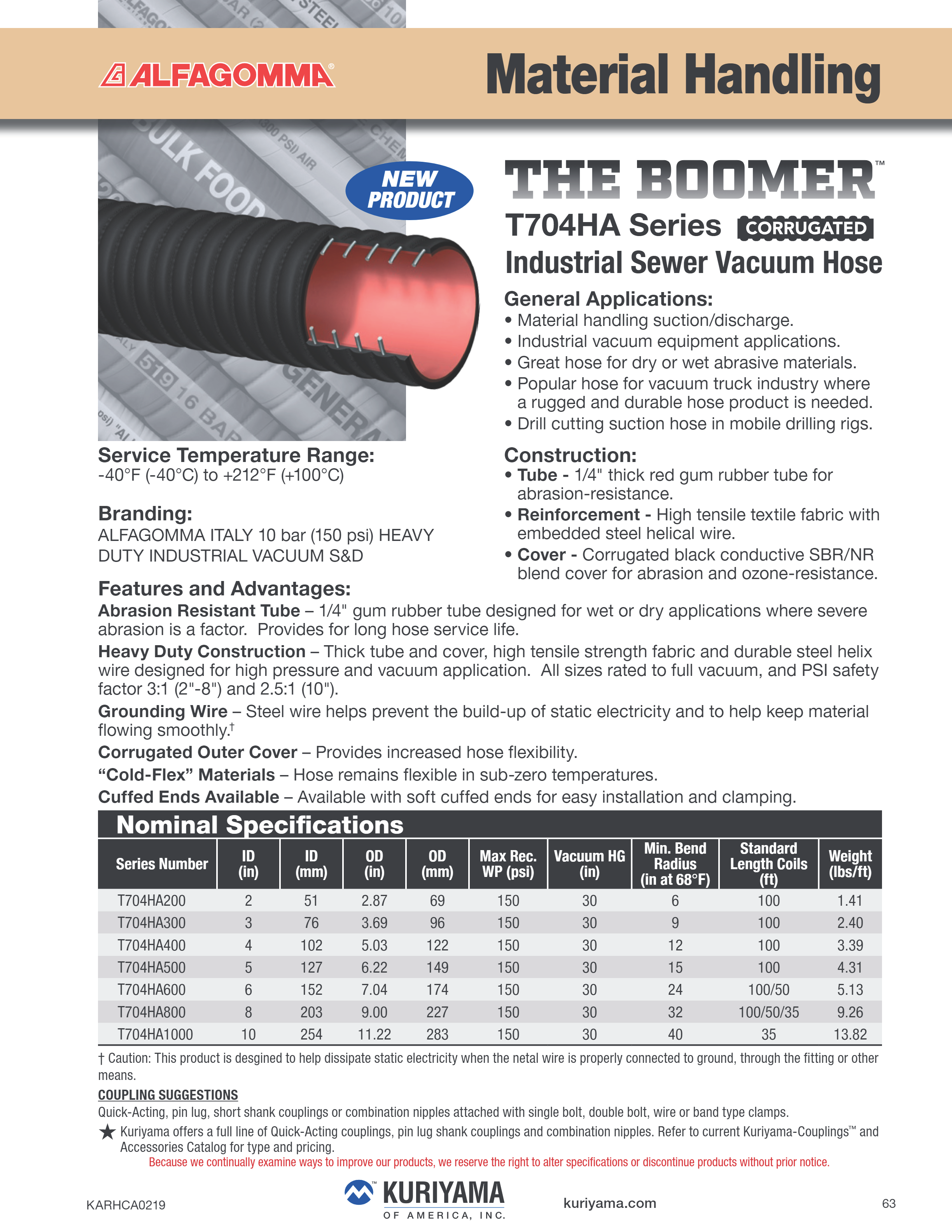 Kuriyama's T704HA Series, The Boomer, Industrial Sewer Vacuum Hose. Great hose for dry or wet abrasive materials and for vacuum truck industry where a rugged and durable hose product is needed.