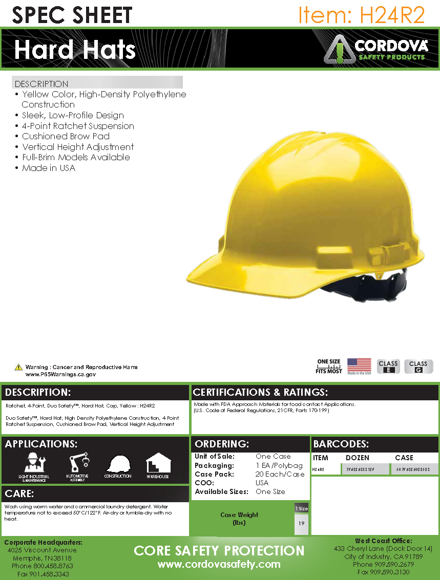 Constructed of high-density polyethylene with a low-profile design and equipped with a 4-point ratchet suspension. Contains a cushioned brow pad, vertical height adjustment, and meets ANSI/ISEA Z89.1-2014 Class E (Electrical) & G (General).